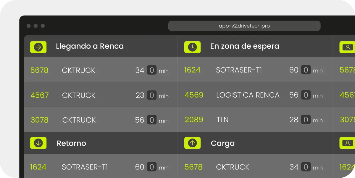 Monitorea cada entrega con ETAs precisos que optimizan la gestión en tus bodegas. A esto sumamos nuestro monitor de CDs, una herramienta que optimiza el flujo de vehículos en tus patios, agilizando los procesos de carga y descarga para evitar cuellos de botella y reducir tiempos de espera.