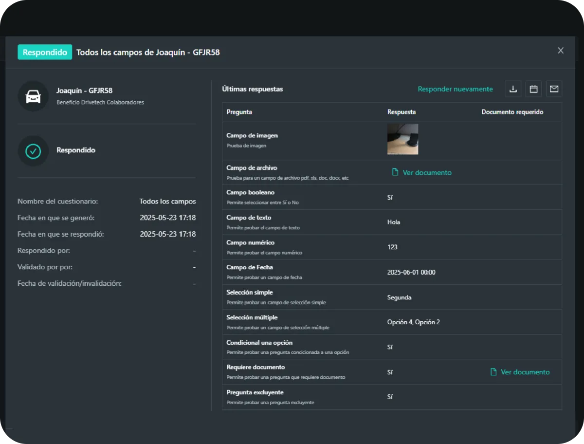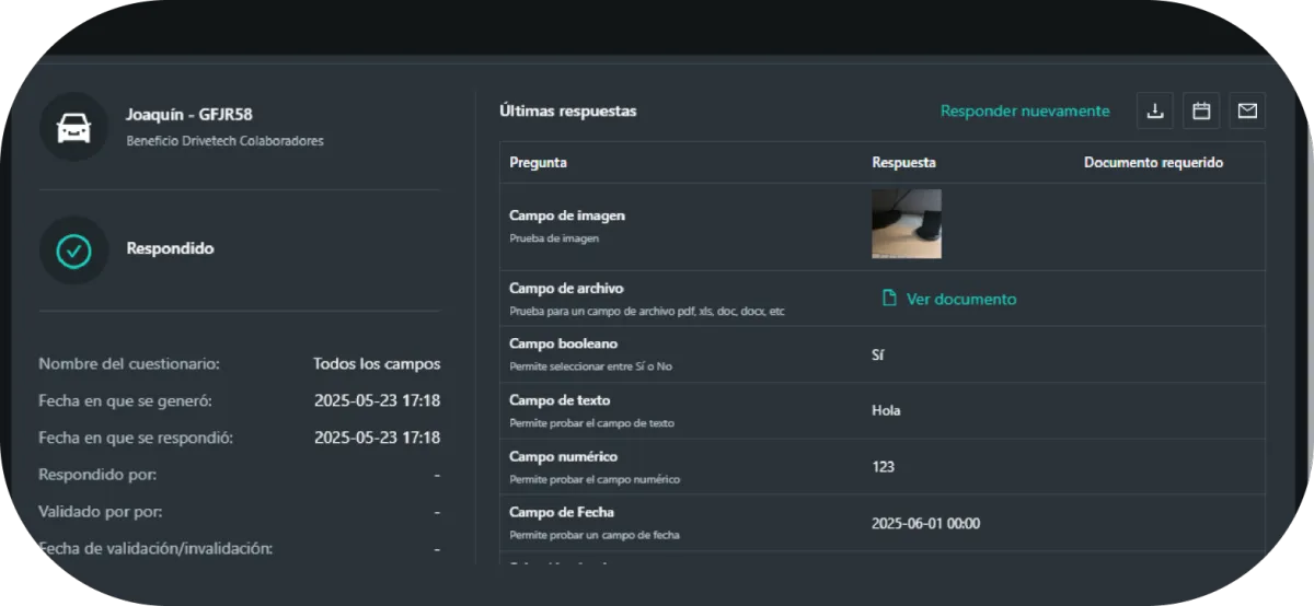 Cuestionarios personalizables: Configura checklists digitales (de seguridad, estado del vehículo u otro) que los conductores deban completar cuando sea pertinente para asegurar que el vehículo esté siempre en condiciones óptimas.