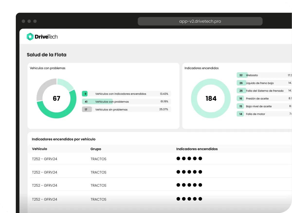 Salud de la flota en tiempo real: Monitorea parámetros críticos como fallas de motor, niveles de aceite, temperatura y más. Recibe alertas automáticas para actuar antes de que ocurran averías mayores