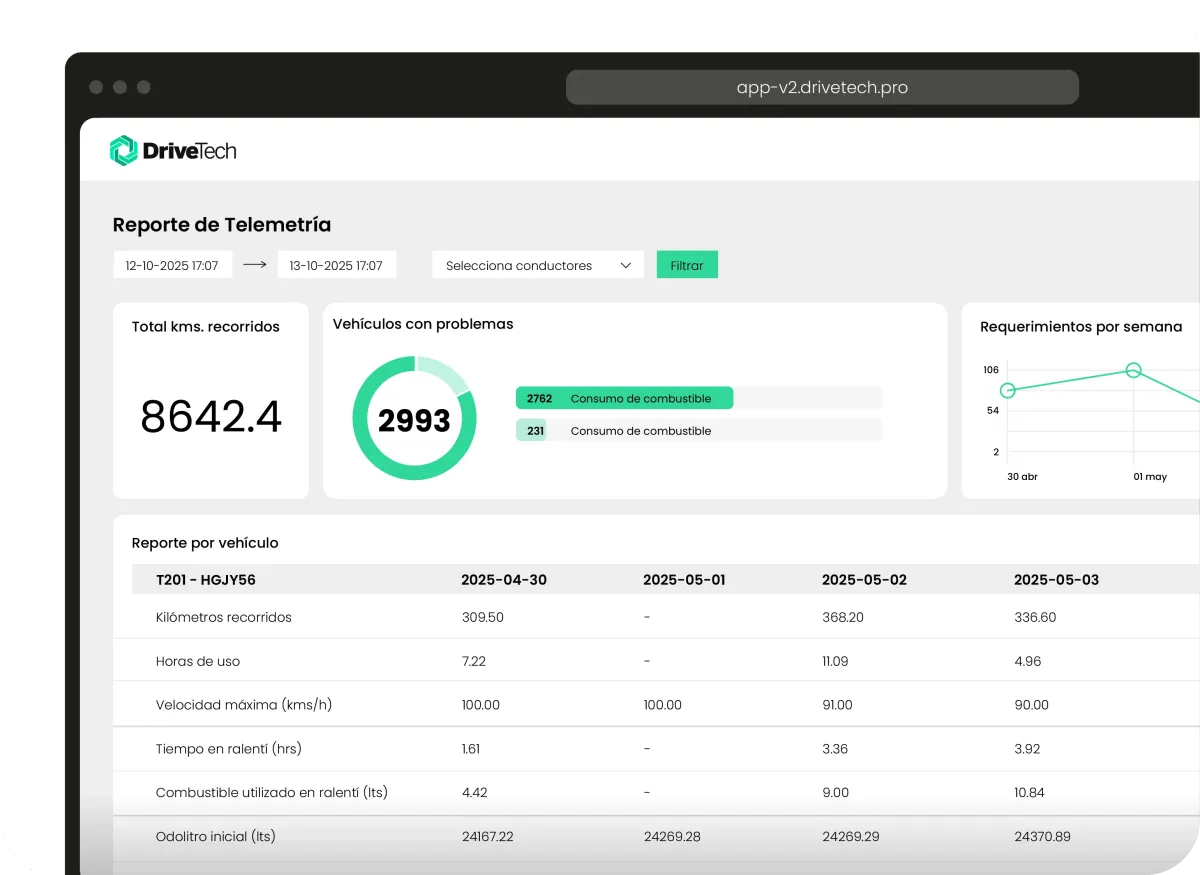 Monitorea el rendimiento de tu flota, anticipa fallas y gestiona el consumo de forma precisa y responsable.